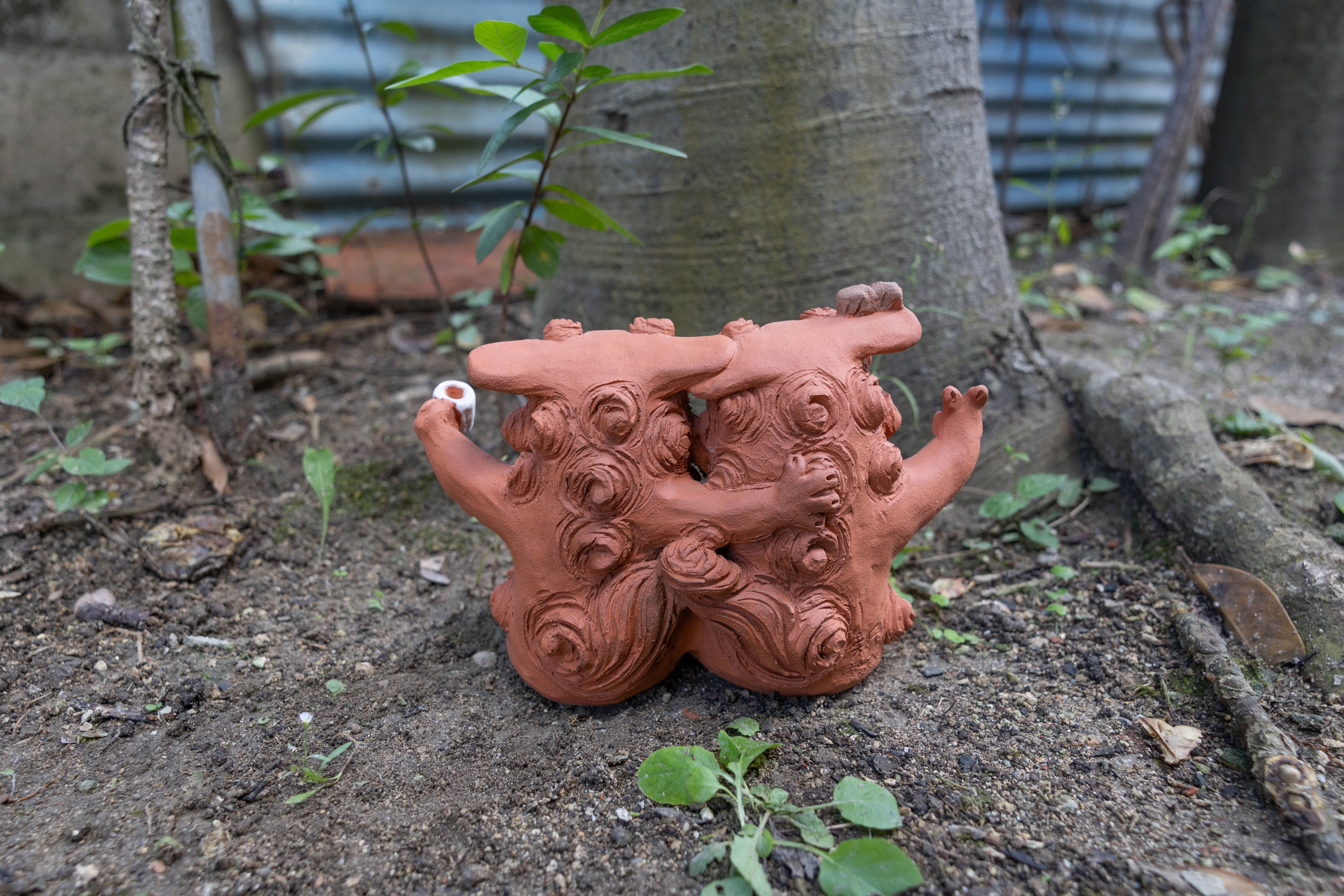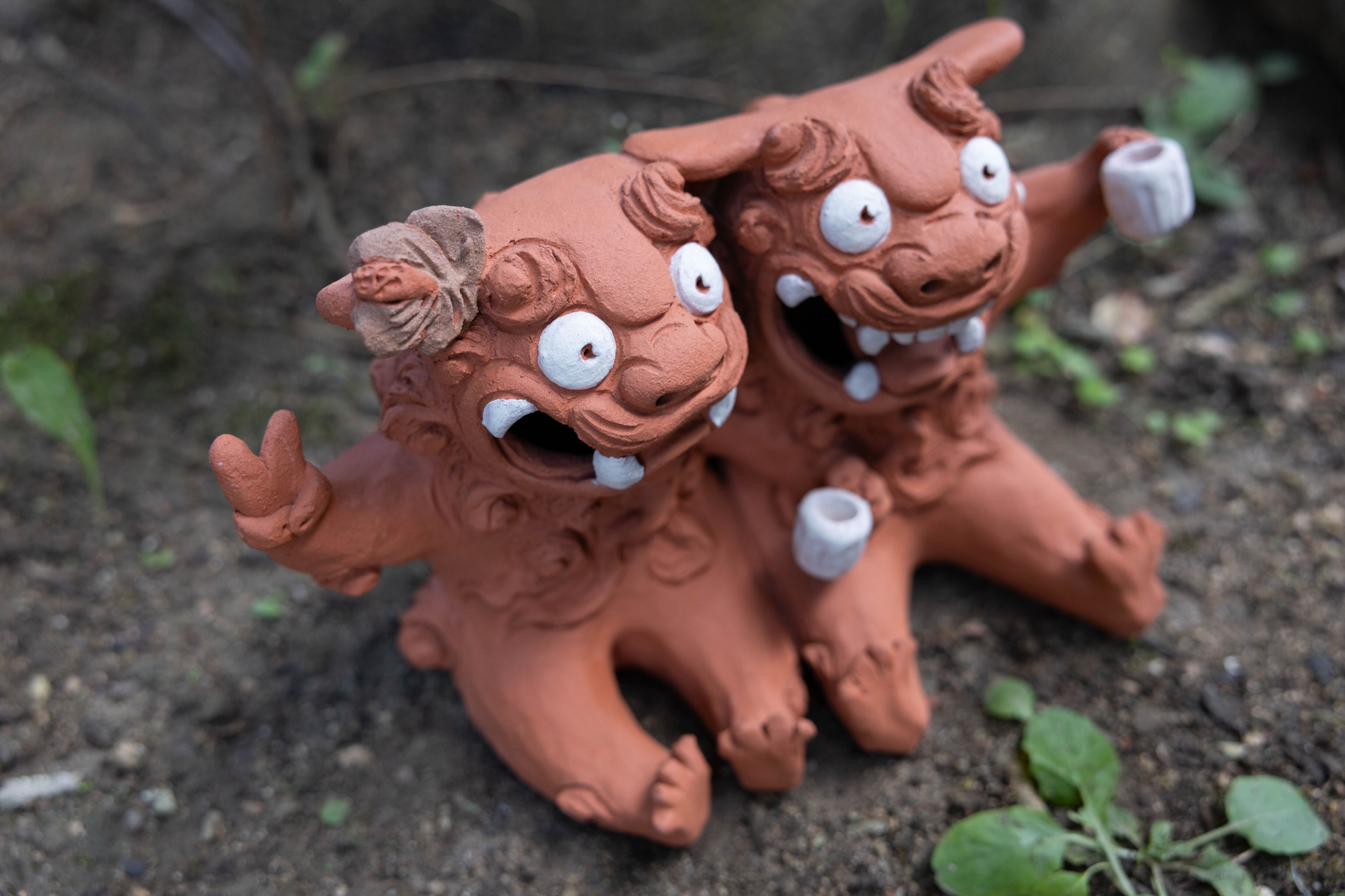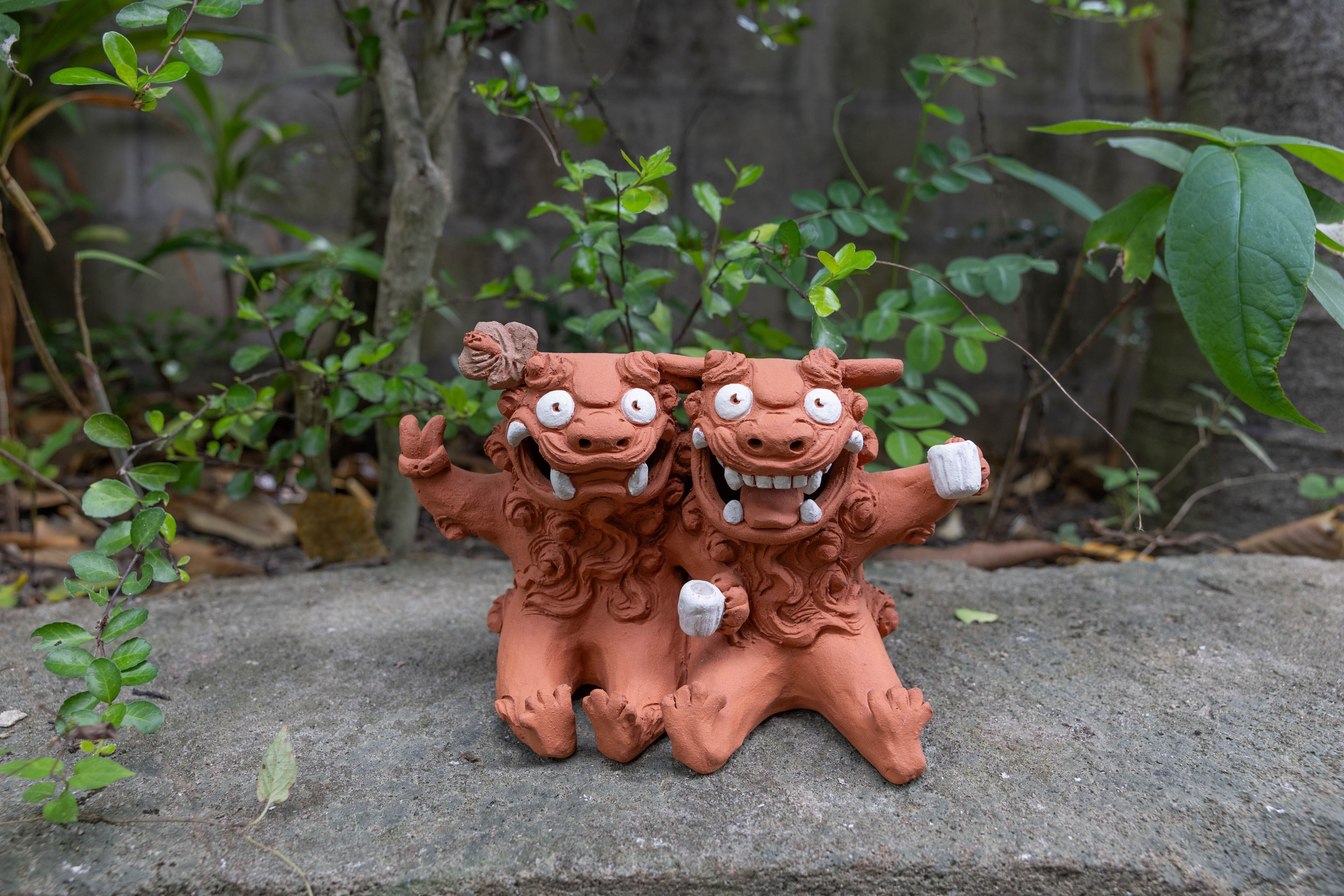 肩を組んで、楽しそうに乾杯しているシーサー。結婚祝いや開業祝い、新たな門出のプレゼントとしても人気のデザイン。